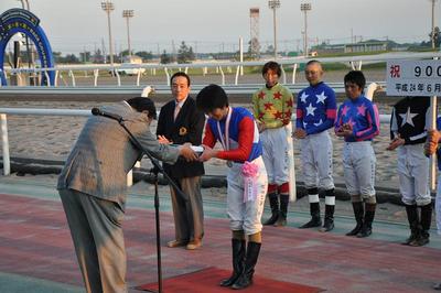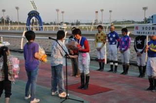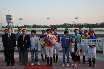 馬渕 繁治騎手900勝達成表彰式 2012.06.27 先週の6月21日(木)に地方・中央通算900勝を達成した馬渕 繁治騎手(佐藤 英明厩舎)の表彰式が本日の第8競走終了後、ウイナーズサークルで行われました。