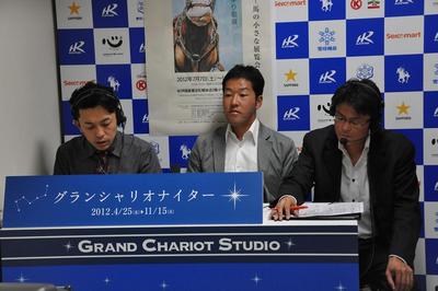 本日のグランシャリオスタジオ(6月28日) 2012.06.28 第9競走のパドック解説ゲストとして、Dr.コパ氏が出演し、注目を寄せる所有馬達の近況について話して頂きました。 第11競走のパドック解説のゲストには、有限会社坂東牧場 社長 坂東正積氏が出演し、同牧場の育成馬の近況や門別競馬場の感想について話して頂きました。 開催期間中に様々な競馬関係者が訪れるグランシャリオスタジオ 来週以降もぜひお見逃しなく! 写真上:Dr.コパ氏 写真下:坂東 正積氏