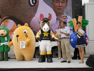 北海道日本ハムファイターズ「北海道祭り2012」キャラクターイベントにホクトくん出演 2012.07.09 7月7日(土)、札幌ドームで行われた北海道日本ハムファイターズ「北海道祭り2012」キャラクターイベントにホッカイドウ競馬からホクトくんが出演し、オープンテラス特設ステージでホッカイドウ競馬のPRを行いました。