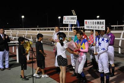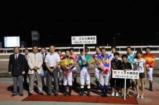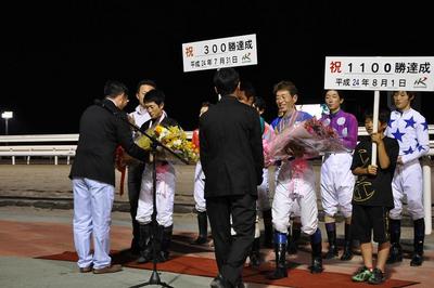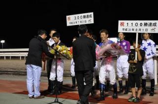 先週の7月31日(火)に地方・中央通算300勝を達成した岩橋勇二騎手(田中 淳司厩舎)と8月1日(水)に地方・中央通算1,100勝を達成した服部 茂史騎手(田中 淳司厩舎)の表彰式が本日の第9競走終了後、ウイナーズサークルで行われました。