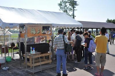 門別競馬場のとねっこ広場では、全国的な知名度を誇る「元祖美唄やきとり福よし」が臨時出店し、限定800本の美唄やきとりが販売されました。
