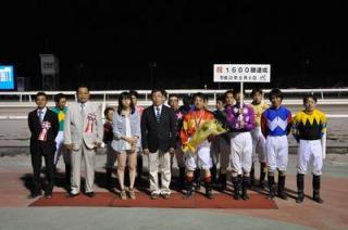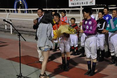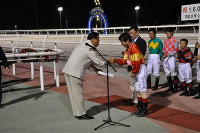 9月4日(火)、地方・中央通算1,600勝を達成した井上 俊彦騎手(林 和弘厩舎)の表彰式が本日の第9競走終了後、ウイナーズサークルで行われました。