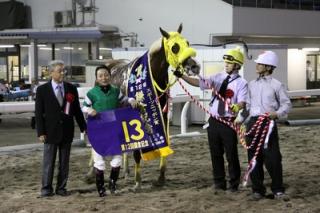 レースは、逃げるウィーゴー号(川崎)のすぐ後ろ2番手につけ、4コーナーに入ってからは、ウィーゴー号をかわすと後続にグイグイと差をつけて、2着ファーストキス号に5馬身差をつけて優勝しました(1.35.9)。
