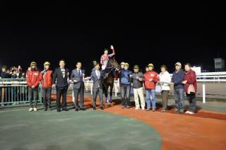 優勝した武豊騎手には、サッポロビール株式会社様よりサッポロ黒ラベル1年分やソメスサドル株式会社様より特製鞍などが贈呈されました。