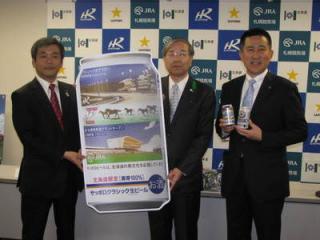 写真中:[右]JRA札幌競馬場場長 河原太一様 [中]北海道副知事荒川裕生様 [左]サッポロビール株式会社北海道本社代表兼北海道本部長高島英也様