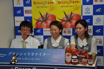 本日のグランシャリオスタジオ(6月26日) 2014.06.26 6月26日(木)、JA平取町「ニシパの恋人」特別のパドックゲストに平取町農業協同組合の内城 春菜様と中鉢 絢様がご出演し、平取町名産の桃太郎トマトの特徴について話して頂きました。 また、JA平取町「ニシパの恋人」特別競走を記念して、来場者先着300名様に「ニシパの恋人」がプレゼントされました。 写真上:中・内城 春菜 氏 右・中鉢 絢 氏 写真中:総合表彰 写真下:「ニシパの恋人」プレゼント