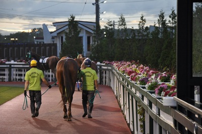 写真下:ダリアで飾られたパドック