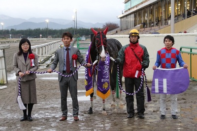 「騎手が上手に乗ってくれて、着順は2着でしたけど、内容的には素晴らしい走りを見せてくれたと思います。最後は勝ち馬に4馬身離されましたから、相手が強かったですね。まぁ、この馬場(水の浮いた不良馬場)でもあったしね。来年もホッカイドウで走る予定ですので、また応援して下さい。」