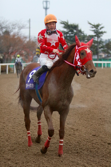 「今回は南関勢が揃っていたので正直『さすがに相手が強いかな』と思ったりもしてたんですが、2着でしたけどこれだけ走ってくれて、南関勢との差を埋められたように思いますね。馬体重は-9でしたけど、JRAの札幌2着の時よりは増えていましたし、減らした影響は感じませんでした。ゲートも出て、序盤はヴェスヴィオあたりをマークしながら進めていきました。距離のロスを考えると内に入れる選択肢もあるんでしょうけど、勝負所で外から一気に来られたりすると(コーナーのキツい水沢では)動けなくなってしまう可能性もあるので外から行きました。勝ち馬は羽田盃を獲っただけあって抜け出す脚が速く、さすがに付いて行くのは厳しかったですね。それでも最後まで脚を使ってくれて3着以下は離しましたし、地力は見せられたと思います。このところやっと体がシッカリしてきて、ようやく潜在能力の高さを発揮できるようになりましたので、この先(※ 南関東・大井に移籍予定)も楽しみのある馬。引き続き、応援してあげて下さい。」