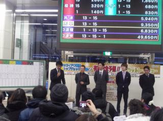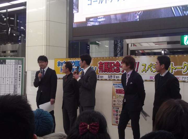 [JRA・ウインズ札幌]ホッカイドウ競馬現役騎手による有馬記念(GⅠ)展望トークショー開催! イベント 2015.12.26 本日(12月26日)、JRAウインズ札幌の特設ステージで、ホッカイドウ競馬所属騎手4名による有馬記念の展望トークショーが行われました。 トークテーマは、翌日に迫った「有馬記念(GI)俺ならこの馬に乗りたい!」という点から、出演した櫻井拓章騎手、五十嵐冬樹騎手、宮崎光行騎手、阪野学騎手の独自の視点からの有馬記念の予想を披露。トークショーを聞き入ったお客様もメモを取るなどして、普段なかなか聞くことの出来ない騎手目線からの予想に興味津々の様子でした。