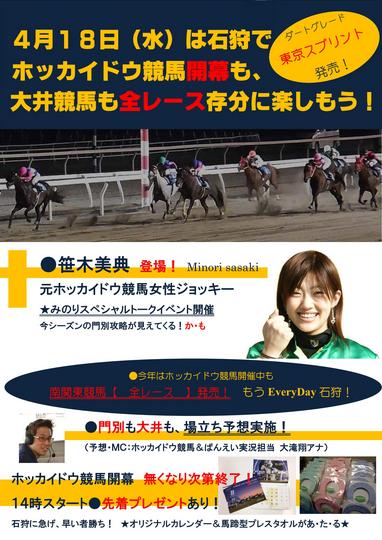 Aiba石狩(サテライト石狩)では、ホッカイドウ競馬が開幕する4月18日(水)に、笹木美典元騎手によるトークイベント(予想・MC:大滝翔アナウンサー)が行われますので、お近くの方はぜひ足をお運びください。