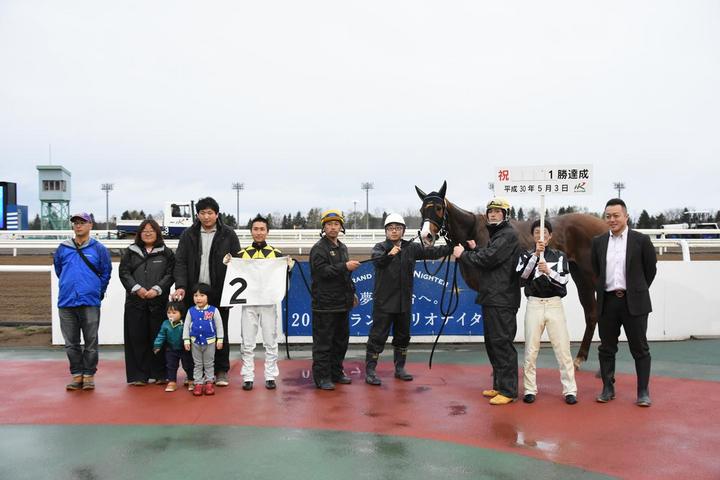 平成30年5月3日(祝木)、門別競馬場 第2競走で落合 玄太(おちあい げんた)騎手(田中 淳司きゅう舎所属)がクィーンアリス号に騎乗し、16戦目で初勝利を挙げましたのでお知らせいたします。