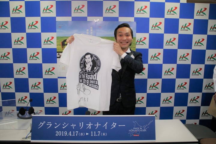 5月1日(祝水)ホッカイドウ競馬オフィシャルサポーター・上杉周大さんの来場イベントおよび協賛競走「上杉周大 燃える流星賞」の開催記念として、先月、東京・札幌の2会場で行われた「ホッカイドウ競馬presents上杉周大Hit The Road TOUR 2019」の『サイン入りツアーTシャツ』を抽選で3名様にプレゼントいたします。ご希望の方は住所・氏名・年齢・職業・電話番号を記入のうえ、Eメールでご応募ください。応募期間と応募先は以下のとおりです。皆様のご応募お待ちしております。