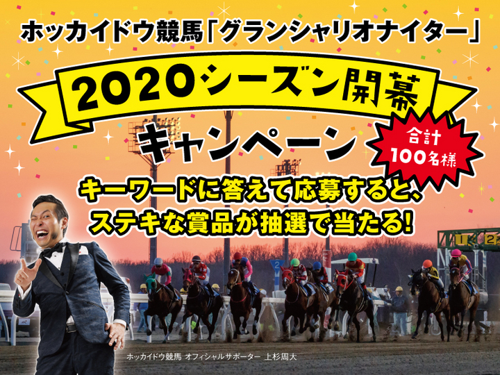 2020年度のホッカイドウ競馬が4月15日(水)に開幕することを記念し、北海道を代表するホッカイドウ競馬連携企業各社および、“地方競馬の祭典”JBC競走の開催パートナーである東京シティ競馬のグッズなどが、抽選で100名様に当たるプレゼントキャンペーンを実施いたします。ご希望の方は郵便番号・住所・氏名・職業・電話番号・キーワードを記入のうえ、Eメールでご応募ください。キャンペーンの詳細については、以下のとおりです。皆様のご応募お待ちしております。