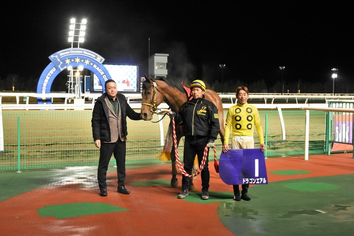 本年度ホッカイドウ競馬の最初の重賞競走、サッポロビール杯 第10回 コスモバルク記念〔H2〕(ゴールドシップ賞)[ ダート1,800m(外) 曇・稍重 ]が行われ、4番人気ドラゴンエアルが2着ステージインパクトに1/2馬身差をつけて優勝しました。(タイム:1.56.7)
