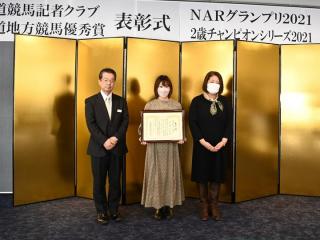 また、これらの表彰式の開催にあわせて、表彰式典が中止となった「NARグランプリ2021」の受賞者(ホッカイドウ競馬関係者)、および「2歳チャンピオンシリーズ2021」においてみごと総合優勝を果たしたナッジの関係者の表彰も行われました。