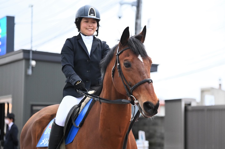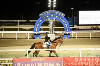 以前は、JRA札幌競馬場で誘導馬を務めており、経験は十分。初めての門別競馬場のナイターも動じることなく、無事に誘導馬としてお仕事を終えました。