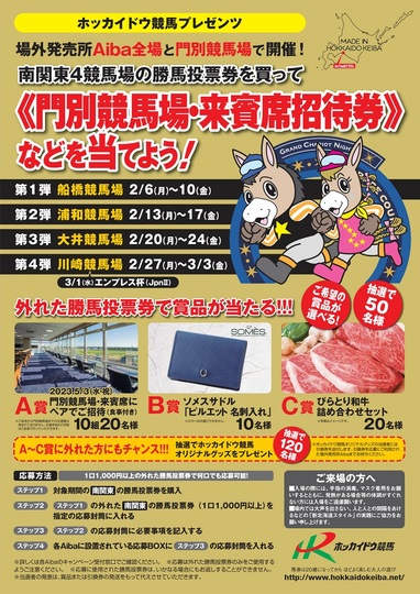 ホッカイドウ競馬場外発売所Aiba(J-PLACE)および門別競馬場では、2月6日(月)から3月3日(金)までの間、「南関東4競馬場の勝馬投票券を買って《門別競馬場・来賓席招待券》などを当てよう!」イベントを実施いたします。