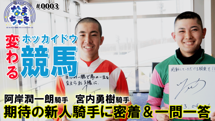 なまら(めちゃくちゃ)はっちゃき(熱中する)という北海道を掛け合わせて「なまちゃき」です!これからめちゃくちゃホッカイドウ競馬に熱中してもらえるチャンネルを目指していきます。今回は開幕直前スペシャルその③として、今回の動画は、期待の新人騎手阿岸潤一朗騎手と宮内勇樹騎手に密着&二人の事がよくわかる一問一答を行いました!