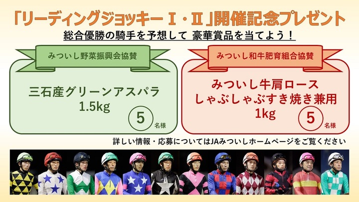 ご希望の方はJAみついしホームページの応募専用バナーより、リーディングジョッキーⅠ・Ⅱの総合優勝騎手を予想し、ぜひご応募ください。