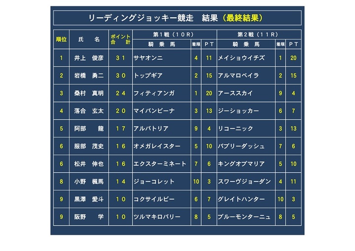 なお、リーディングジョッキー競走の結果については以下のとおりとなりました。