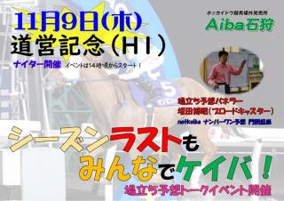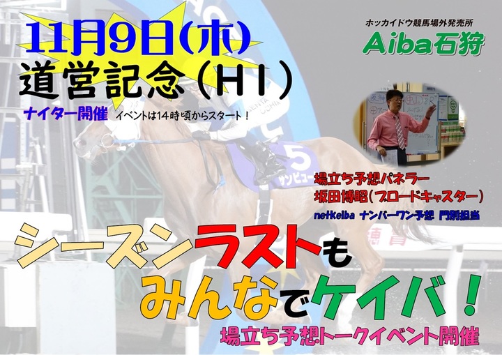 Aiba石狩イベントについて(11月9日) イベント 2023.10.26 Aiba石狩では、11月9日(木)に道営記念イベントを実施いたします。ブロードキャスター坂田博昭さんによる門別ナイト全競場立ち予想トークイベント開催を行いますので、皆さまぜひお越しください。