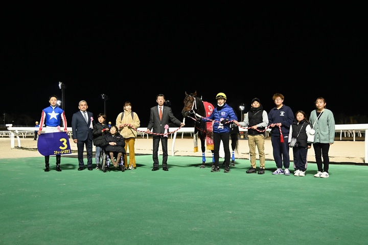 また、同馬を管理する角川秀樹調教師は道営スプリント5勝目(最多タイ)、騎乗した桑村真明騎手は道営スプリント4勝目(最多)となりました。