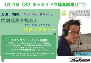 Aiba札幌駅前イベントについて(4月17日) イベント 2024.04.15 Aiba札幌駅前では、4月17日(水)にホッカイドウ競馬開幕イベントを実施いたします。競馬実況アナウンサー大滝翔さんによる門別競馬場予想会&イベントコンプリートを行いますので、皆さまぜひお越しください。