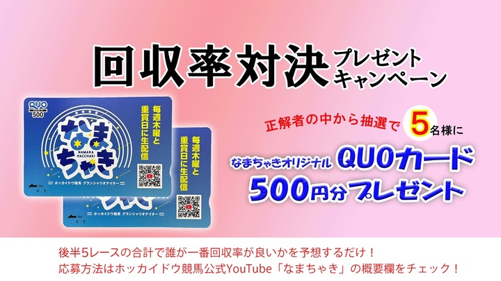 また、今回のなまちゃきは、後半5レースの回収率対決を実施しております。視聴者の皆様には、誰が回収率で一番となるのか予想して頂き、的中者のなかから抽選で5名様に「なまちゃきクオカード」をプレゼントしちゃいます。詳細については、概要欄に応募URLが記載されておりますので、皆様のご投票をお待ちしております。