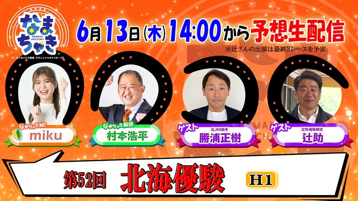 次回のなまちゃきLIVEは、6月13日(木)に配信予定。メインレースに伝統の第52回北海優駿が行われる今回のゲストは、元JRAの騎手として活躍した勝浦正樹さんが「なまちゃき」に初出演。また、生産者ゲストとして、有限会社辻牧場の辻助さんが初出演。ホッカイドウ競馬では、ハッピースプリントなどの活躍でお馴染みで、活躍馬を多数輩出している名門牧場です。(辻さんは、後半3レースの出演予定)