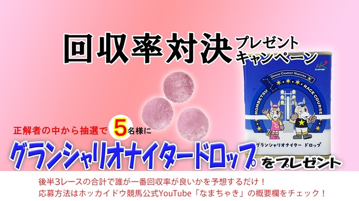 また、今回のなまちゃきは、後半3レースの回収率対決を実施しております。視聴者の皆様には、誰が回収率で一番となるのか予想して頂き、的中者のなかから抽選で5名様に「グランシャリオナイタードロップ」をプレゼントしちゃいます。詳細については、概要欄に応募URLが記載されておりますので、皆様のご投票をお待ちしております。