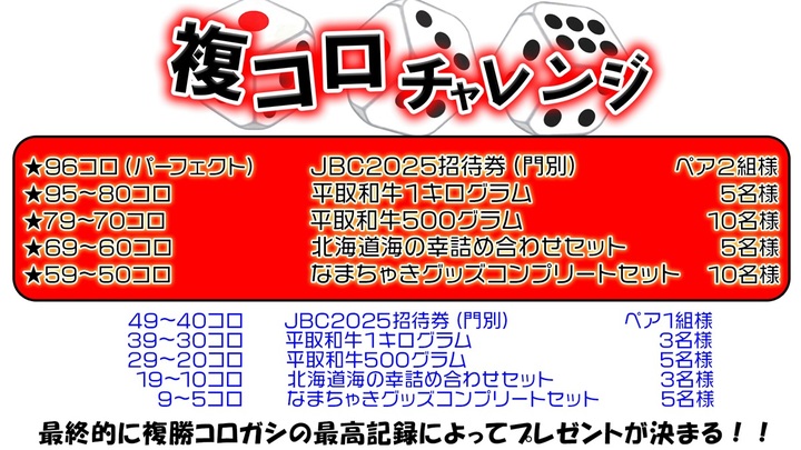 さらに、こちらも新企画として「複コロチャレンジ」もスタート!こちらは、以前の夢馬券企画の進化版として実施。視聴者の皆様とトヨDが一緒になって、最終日の期間中に複勝コロガシの最高記録数によってプレゼント賞品が決まる視聴者参加型企画となっております。現在の最高記録は13コロ(北海道海の幸詰め合わせセット 3名獲得)。次回は、2コロからスタートしますので、なんとか最高記録を目指して頑張りたいところです。