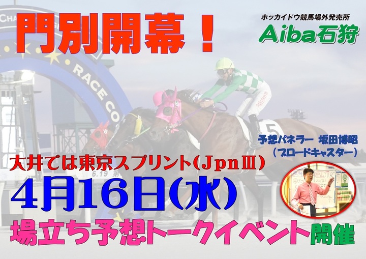 Aiba石狩イベントについて(4月16日) イベント 2025.04.10 Aiba石狩では、4月16日(水)に門別開幕イベントを実施いたします。ブロードキャスター坂田博昭さんによる場立ち予想トークを行いますので、皆さまぜひお越しください。