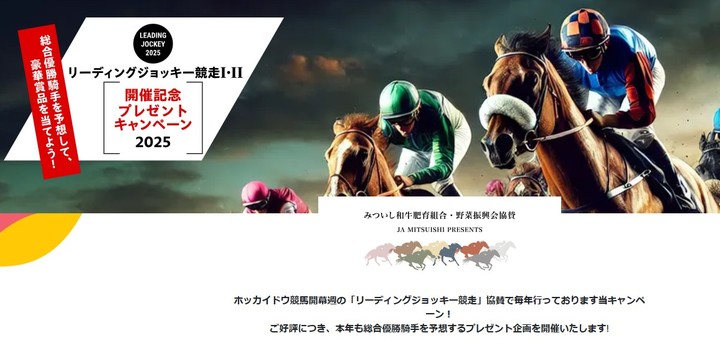 ご希望の方はJAみついしホームページの応募専用バナーより、リーディングジョッキーⅠ・Ⅱの総合優勝騎手を予想し、ぜひご応募ください。