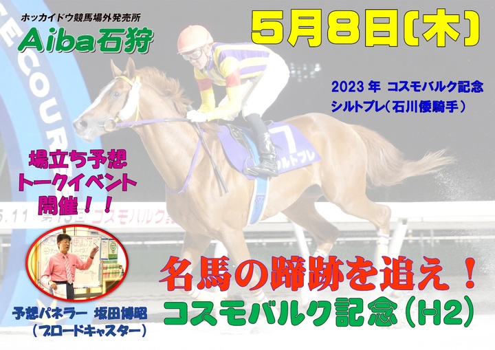 Aiba石狩イベントについて(5月8日) イベント 2025.04.28 Aiba石狩では、5月8日にイベントを実施いたします。ブロードキャスター坂田博昭さんによる場立ち予想トークを行いますので、皆さまぜひお越しください。