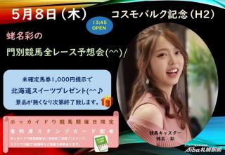 Aiba札幌駅前イベントについて(5月8日) イベント 2025.04.28 Aiba札幌駅前では、5月8日(木)に競馬キャスター蛯名彩さんによる門別競馬場全レース予想会&北海道スイーツプレゼント、スタンプラリーイベントを行いますので、皆さまぜひお越しください。