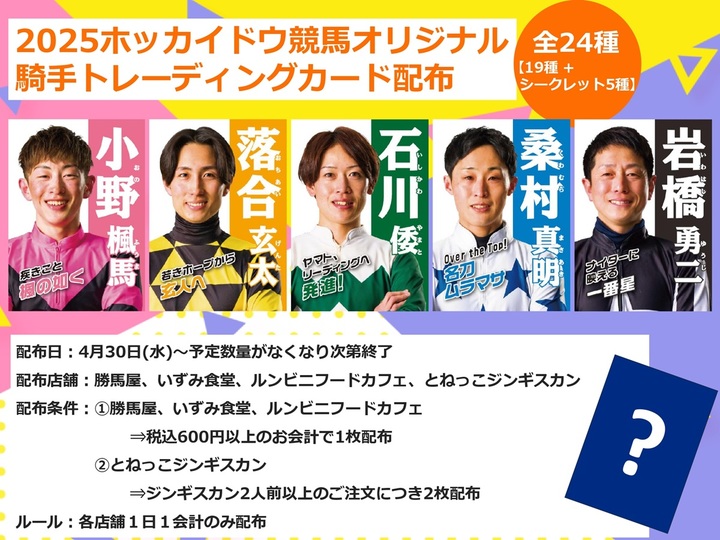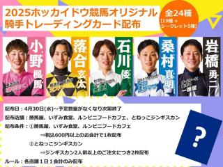門別競馬場では、4月30日(水)より場内の飲食施設をご利用した方を対象に「2025ホッカイドウ競馬オリジナル騎手トレーディングカード」を配布します。