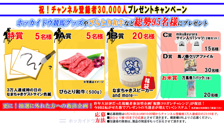 YouTubeチャンネルである【公式】ホッカイドウ競馬チャンネルのチャンネル登録者数3万人を目標としたプレゼントキャンペーンをスタートします!
