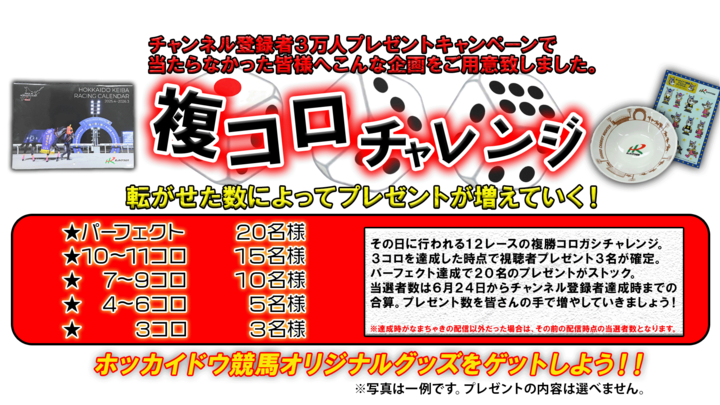 さらに追加企画!!昨年好評だった複コロチャレンジも実施!複コロの結果で抽選に外れた方にもホッカイドウ競馬グッズが当たります!協力して連続的中を目指しましょう!