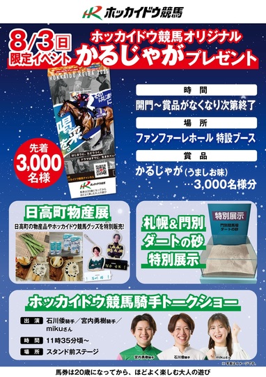 8月3日(日)の札幌競馬場では、「ホッカイドウ競馬イベント in 札幌競馬場」を実施いたしますので、皆様のご来場をお待ちしております。