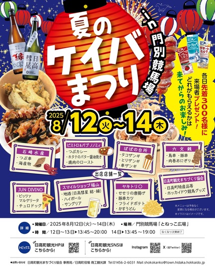 8月12日(火)~ 8月14日(木)の3日間、門別競馬場において「夏のケイバまつりin門別競馬場」を開催いたします。ファミリー向けの体験イベントやグルメ出店などを実施しますので、ご家族・ご友人とお誘い合わせのうえご来場ください。