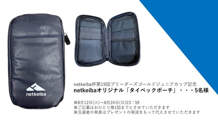8月21日(木) netkeiba杯第19回ブリーダーズゴールドジュニアカップを記念してnetkeibaオリジナル「タイベックポーチ」を5名様にプレゼントいたします。